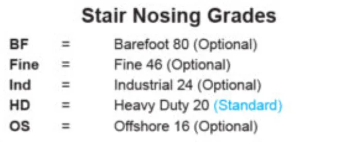 Manufactured from robust substrates such as aluminum, stainless steel, or reinforced fiberglass composites, APEX nosings combine strength with corrosion resistance, ensuring reliable performance over years of demanding use. The top surface is coated with high-friction mineral grit or engineered tread patterns that maximize traction, giving each step confidence and security. Whether installed in offshore platforms exposed to seawater, industrial plants dealing with oil and dust, or high-traffic public facilities, our stair nosings maintain exceptional grip where it is needed most.