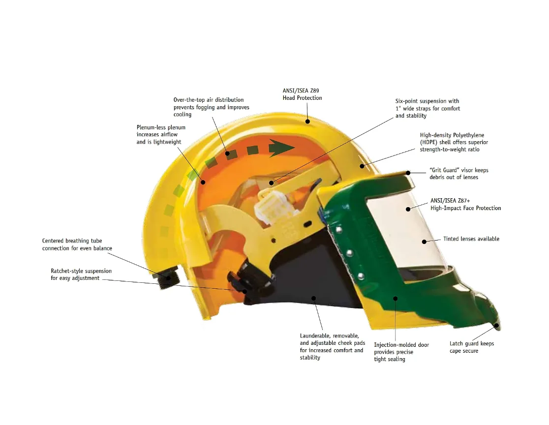The GVX2830 Complete Airline Respirator from Bullard is the latest in blasting equipment, providing a complete solution to your grinding and blasting needs. The Complete GenVX2830 Series Respirator includes the newest GenVX blasting helmet from Bullard, which provides users with the industry’s lightest, coolest, most comfortable, and most dependable helmet on the market for abrasive blasting and painting. The GenVX helmet is coupled with a GVXPL Adjustable Flex-Gear® Ratchet Headband Suspension for better comfort during use and better shielding against impacts.