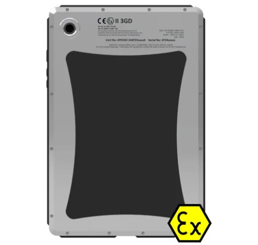 Compliance with ATEX / EX regulations is achieved by modification of the casing together with the intrinsically safe electrical circuit, which makes the tablets suitable for safe use in hazardous locations. Nearly all features of the original product are preserved, except for the fingerprint scanner. Passive stylus is available on request for touch with glove operations.